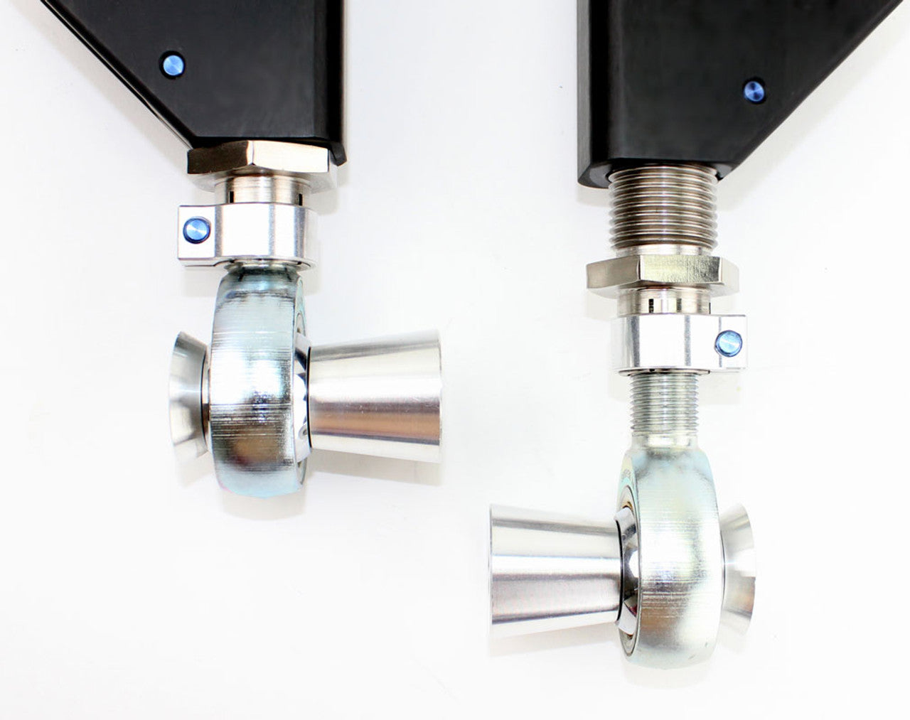 Anti dive adjustment is achieved with Stainless Steel spacers for the forward mounting position of the trailing/caster arm allowing you to raise or lower this pivot point. Roll center correction is achieved with Stainless Steel spacers that work in conjunction with the heat treated 4130 Chromoly Ball Joint Stud, allowing you to lower the ball joint location at the knuckle. Finally, the use of FK Rod Ends and Spherical Bearings eliminates the flex and binding found in the OEM control arms while allowing smooth articulation.